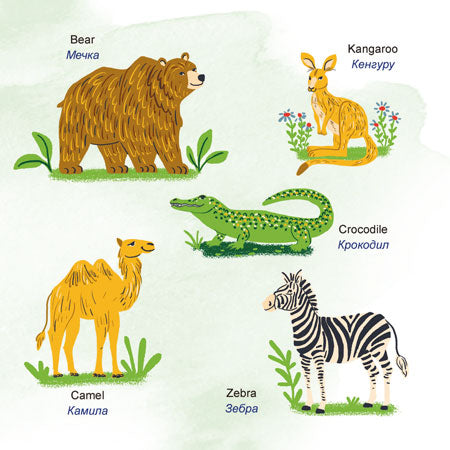 Децата ще научат имената на животните от целия свят — от джунгли и океани до ферми и заснежени земи. Всяко животно е представено с цветна илюстрация, която помага на децата да разпознават и запомнят новите думи по-лесно. Книгата включва и забавни факти за животните!