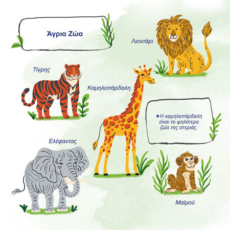 Κάθε σελίδα ομαδοποιεί τα ζώα ανάλογα με το πού ζουν ή το πώς συμπεριφέρονται, κάνοντας τη μάθηση διασκεδαστική και εύκολη.