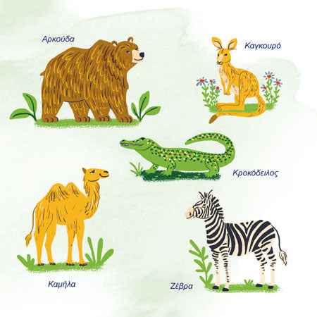 Τα παιδιά θα ανακαλύψουν ονόματα ζώων από όλο τον κόσμο — από ζούγκλες και ωκεανούς μέχρι φάρμες και χιονισμένες περιοχές. Κάθε ζώο παρουσιάζεται από μια πολύχρωμη εικόνα που βοηθά τα παιδιά να αναγνωρίσουν και να θυμούνται τις νέες λέξεις. Το βιβλίο περιλαμβάνει επίσης διασκεδαστικά γεγονότα για τα ζώα!