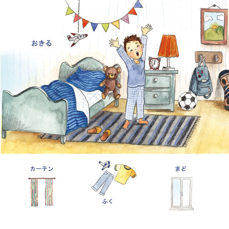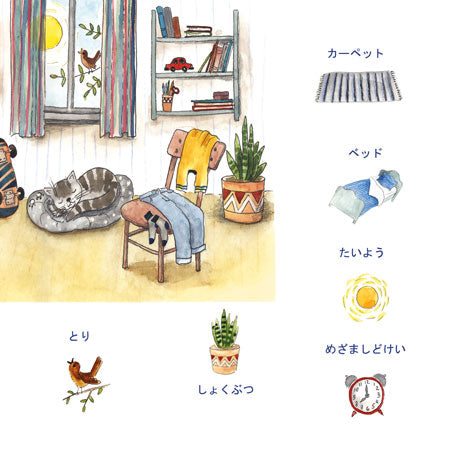 「歯ブラシ」「りんご」「毛布」 などの重要な単語が絵の中に登場し、別途イラストでも表示されています。これにより、子供たちは世界を探検しながら言葉を認識し、読めるようになります。