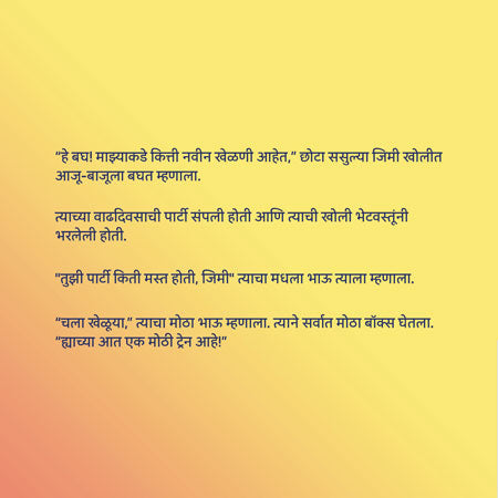 рдЬрд┐рдореА рдЖрдгрд┐ рддреНрдпрд╛рдЪреНрдпрд╛ рд╕рд╕реБрд▓реНрдпрд╛ рднрд╛рд╡рд╛рдВрдирд╛ рдЦреЗрд│рд╛рдпрд▓рд╛ рдЦреВрдк рдЖрд╡рдбрддрдВ. рдЖрдЬ рдЬрд┐рдореАрдЪрд╛ рд╡рд╛рдврджрд┐рд╡рд╕ рдЖрд╣реЗ рдЖрдгрд┐ рддреНрдпрд╛рдЪреНрдпрд╛рдХрдбреЗ рдЦреВрдк рдЦреЗрд│рдгреА рдЖрд╣реЗрдд. рдкрдг, рддреНрдпрд╛рд▓рд╛ рд╕реНрд╡рддрдГрдЪреНрдпрд╛ рд╡рд╕реНрддреВ рджреНрдпрд╛рдпрд▓рд╛ рдиреЗрд╣рдореАрдЪ рдЖрд╡рдбрддрдВ рдЕрд╕рдВ рдирд╛рд╣реА, рдЖрдгрд┐ рдореНрд╣рдгреВрдирдЪ, рддреЛ рдХрдзреАрдХрдзреА рдЖрдирдВрджрд╛рд▓рд╛ рдореБрдХрддреЛ. рдЪрд▓рд╛ рддрд░ рдмрдШреВрдпрд╛ рдХреА рдПрдХ-рдореЗрдХрд╛рдВрдирд╛ рдЧреЛрд╖реНрдЯреА рджреЗрдгрдВ рдореНрд╣рдгрдЬреЗ рдХрд╛рдп рдЖрдгрд┐ рдЕрд╕рдВ рдХреЗрд▓реНрдпрд╛рдиреЗ рдЖрдкрд▓реНрдпрд╛рд▓рд╛ рдХрд╛ рдмрд░рдВ рд╡рд╛рдЯрддрдВ!
