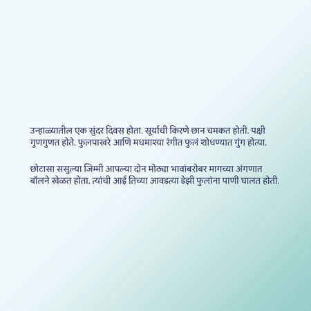 छोटा ससुल्या जिम्मी अडचणीत येतो. तो त्याच्या आईची आवडती फुले चुकून खराब करतो. खोटं बोलला तर त्याची अडचण दूर होईल का? की सत्य काय आहे ते सांगून वेगळ्या पद्धतीने अडचण सोडवायला हवी?