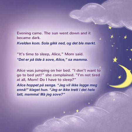 Det er leggetid, men Alice vil ikke sove helt ennå. Gjennom den faste leggekveldsrutinen roer mamma henne ned ved å minne henne på alle de fine tingene de har gjort sammen denne kvelden. Skrevet på en søt og beroligende måte, viser denne boken det varme og kjærlige forholdet mellom Alice og mammaen hennes – samtidig som den forbereder små lesere på en god natts søvn.